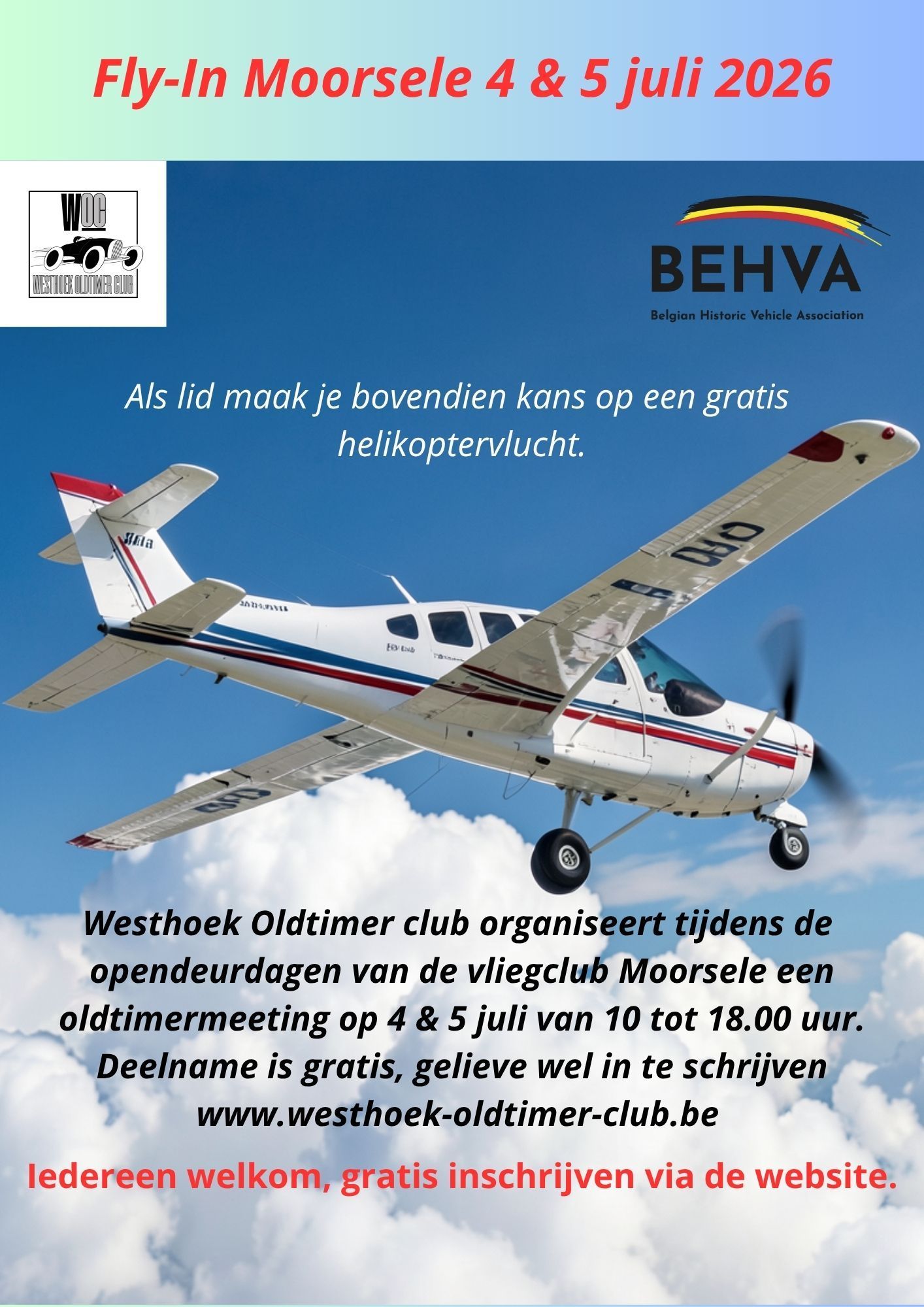- Op zaterdag 4 en zondag 5 juli een oldtimermeeting en een Fly-Inin Moorsele, een samenwerking tussen de vliegclub en WOC, een combinatie van oldtimers en vliegtuigen.